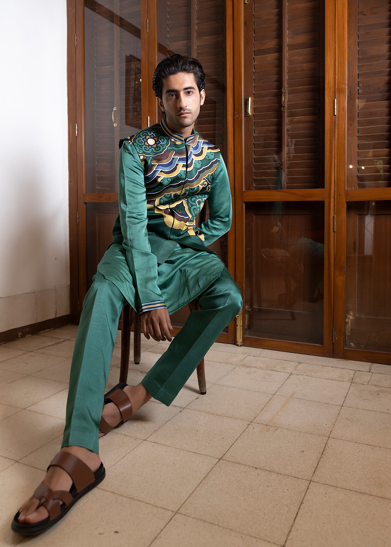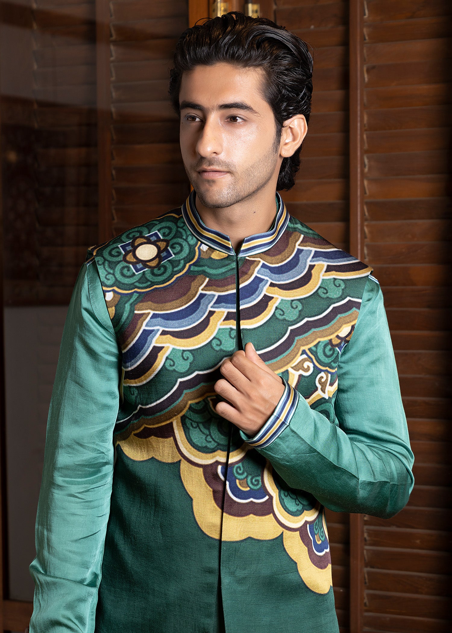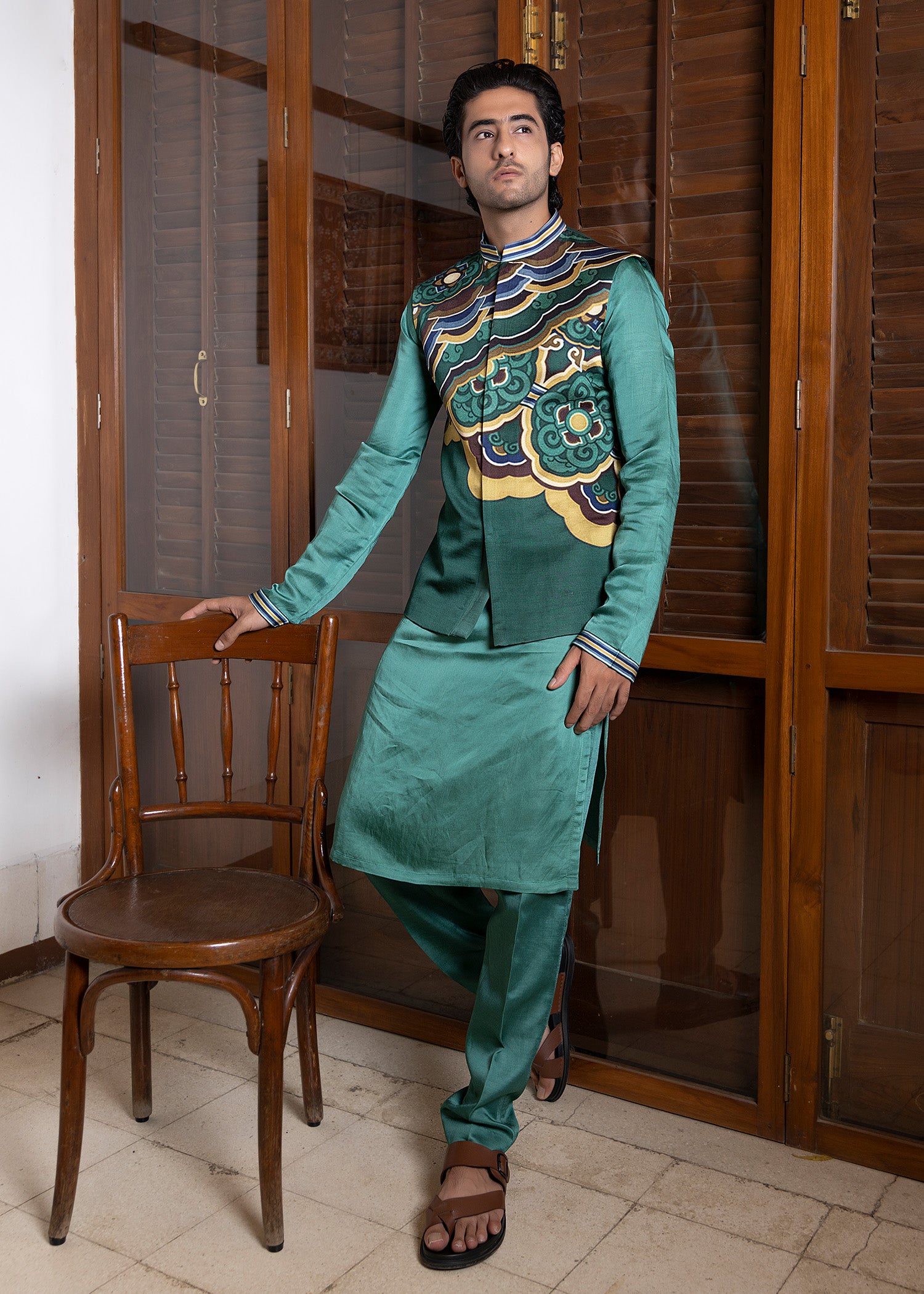 An enchanting monochromatic koti kurta set features a deep sage kurta with intricate printed details.The koti showcases an engineered print to create a cutting-edge look.