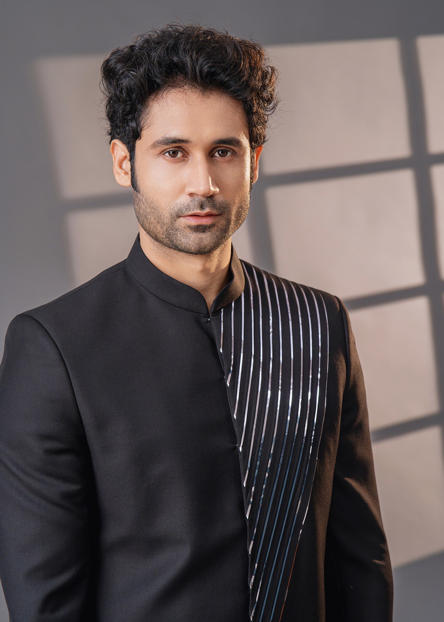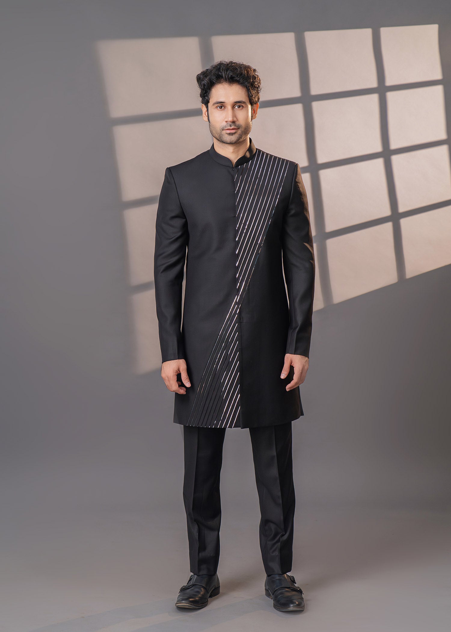 A sleek black Indo-Western ensemble complemented by steel grey accents. With the ample use of reflective lines and an inverted pattern, the flipped symmetry adds to the splendid look.